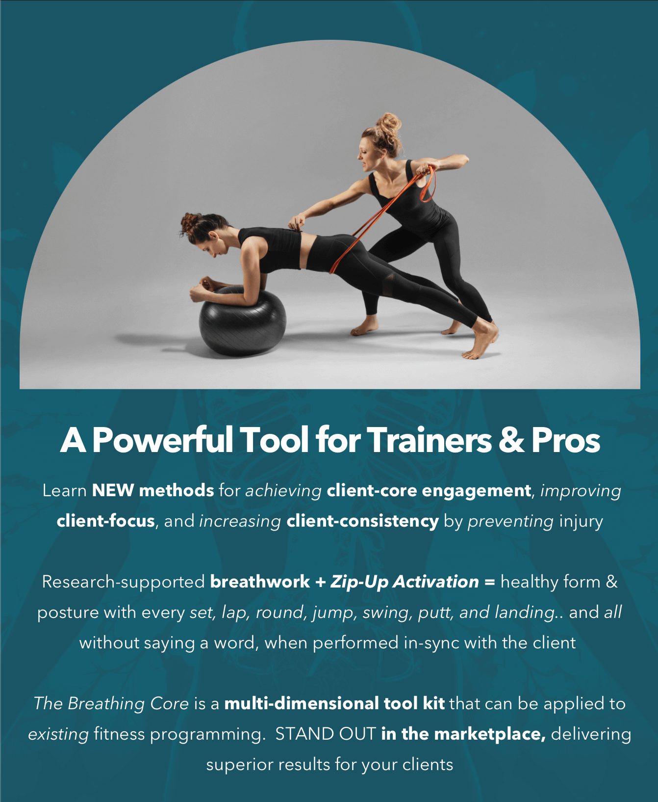 FOR THE PROS: Learn the three pillars of Breathography™ Technique and how to integrate them into client programming. The Breathing Core will teach you how to brace, shape, & optimize using Breathography through coursework, instructional videos, a final test, and an integrated workout. Learn how to prevent injury, decrease stress, and improve body composition and performance with intentional-breathing during exercise